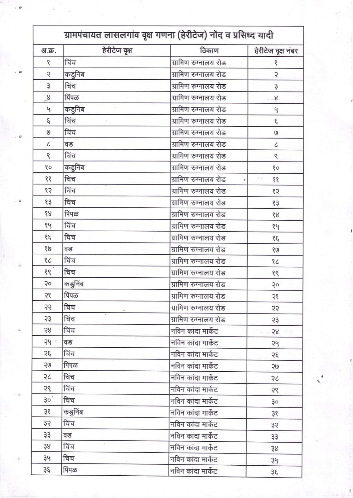 माझी वसुंधरा अभियान ५ ग्रा, पं, लासलगाव हेरिटेज ट्री यादी